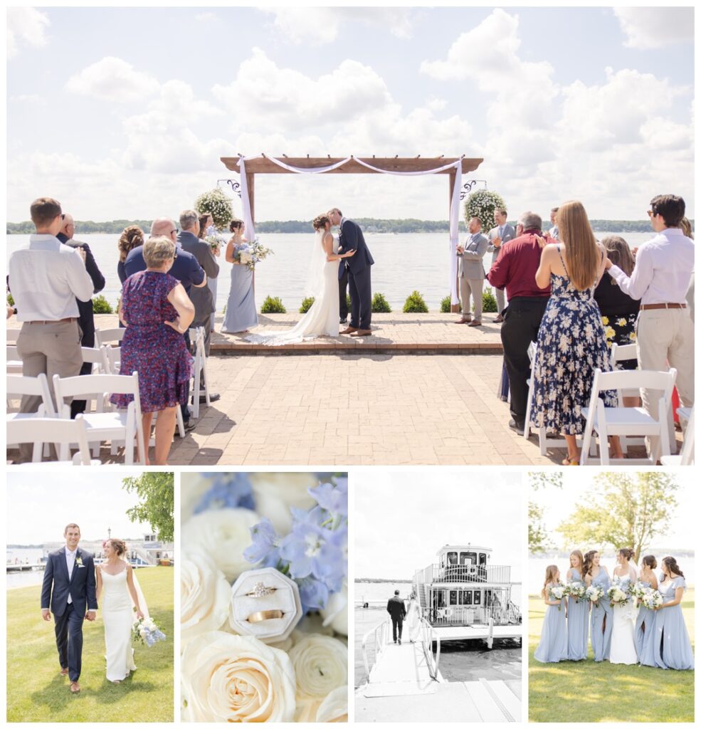 On the wedding day, Lauren got ready in a hotel room on site at the resort, keeping the morning easy and low-key. The couple chose not to do a first look, saving that moment for their outdoor ceremony, overlooking the lake. Baby blue and white details blended naturally into the lakeside setting, giving the ceremony a timeless, effortless feel.